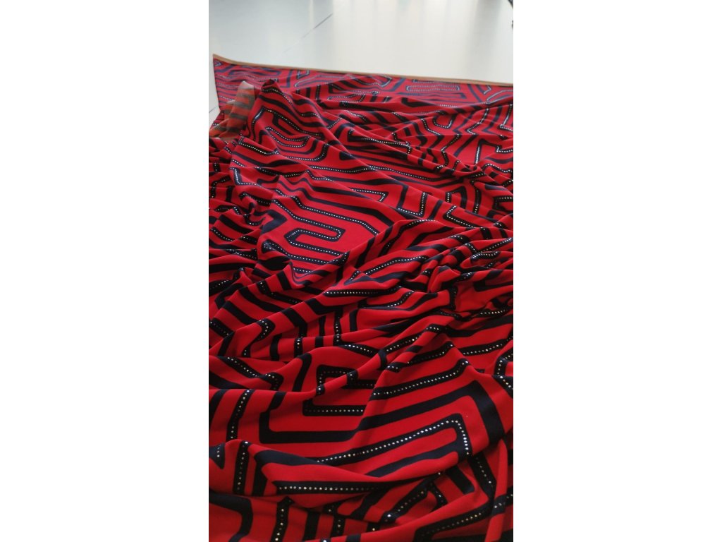 YTY, Šatovka polyester/elasten, modrá geometrie na červené 3D foil, SD220407A OK07 odhad